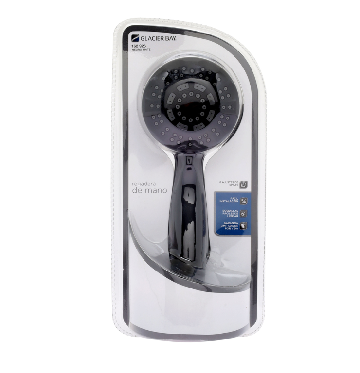 - REGADERA DE MANO GLACIER BAY BRINDA 6 FUNCIONES DE ROCIADO, ESTÁ ELABORADO EN PLÁSTICO.