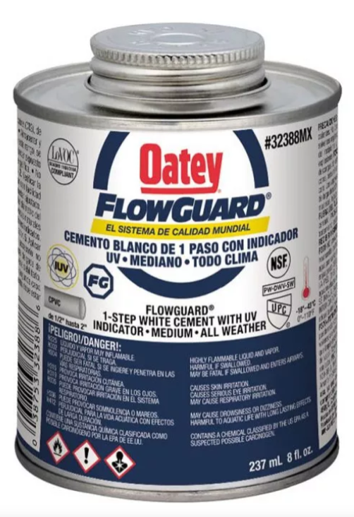 EL PEGAMENTO CPVC OATEY FLOWGUARD ES UNA SOLUCIÓN DE ALTA CALIDAD PARA UNIR TUBERÍAS DE CPVC EN SISTEMAS DE PLOMERÍA Y CALEFACCIÓN.