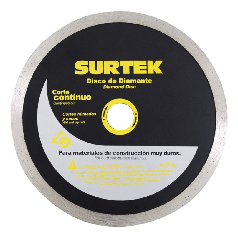 Disco de diamante de corte continuo de 4 1/2 pulgadas marca Surtek, modelo 123460. Diseñado para cortes precisos en materiales como cerámica, azulejo y porcelanato. Alta durabilidad y rendimiento en trabajos de construcción y remodelación.