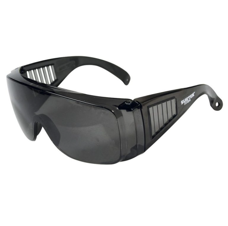 Lentes de seguridad oscuros modelo tradicional marca Surtek, modelo 137324. Ofrecen protección ocular contra impactos y rayos UV. Ideales para trabajos al aire libre o en ambientes con alta luminosidad. Diseño cómodo y resistente.