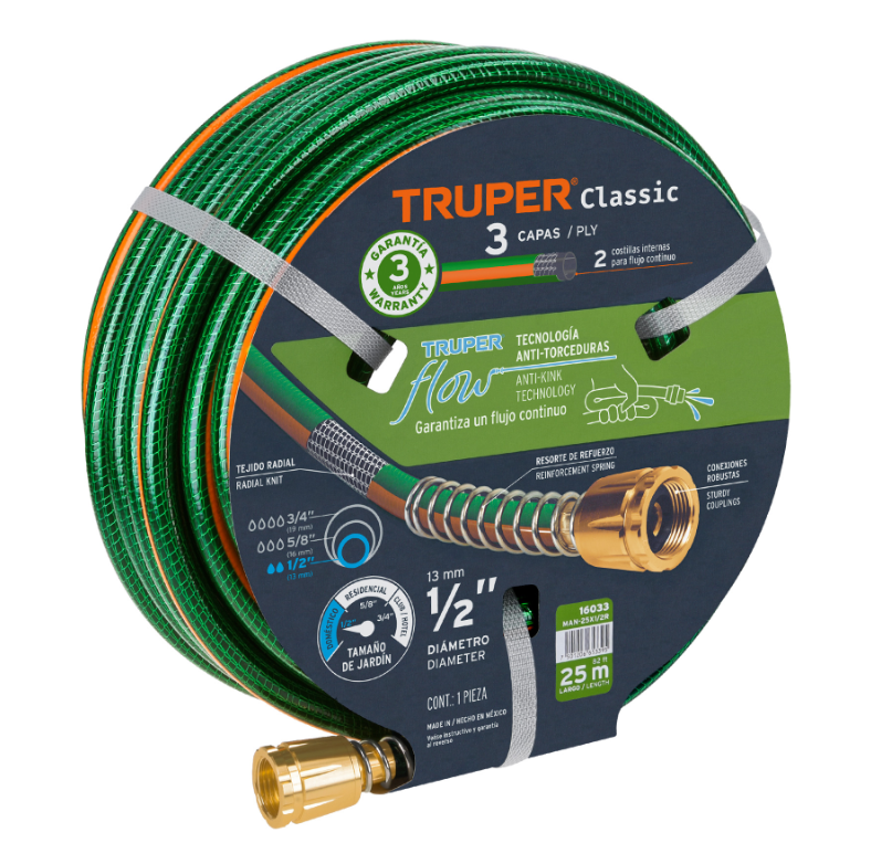 MANGUERA 1/2" REFORZADA 3 CAPAS 25 M CONEXIONES DE METAL