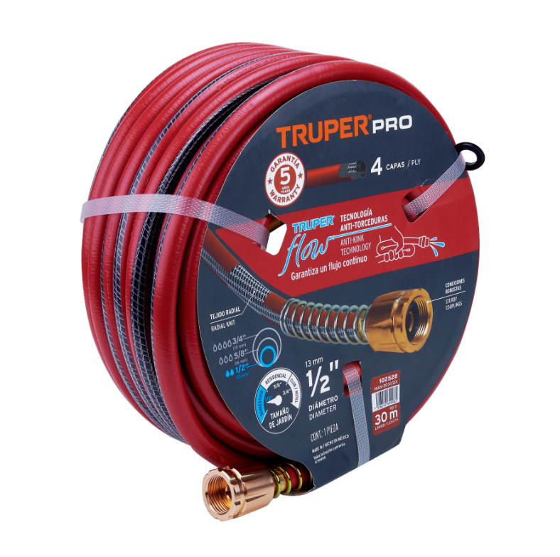 MANGUERA 1/2" SUPER REFORZADA 4 CAPAS 30 M CONEXIONES METAL TRUPER 102528