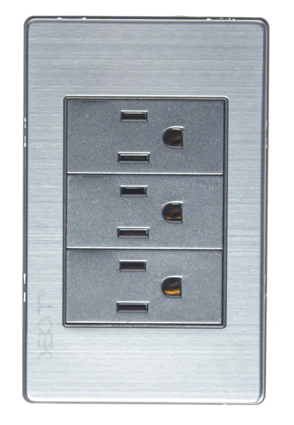 PLACA METÁLICA PLATEADA DE 3 MÓDULOS CON TRES CONTACTOS DE 1 MÓDULO ANODIZADO. 110-250 V. 15 A. ACERO INOXIDABLE. FÁCIL DE INSTALAR. EXCELENTE CALIDAD. PROPORCIONA UNA VISTA MÁS ESTÉTICA.
