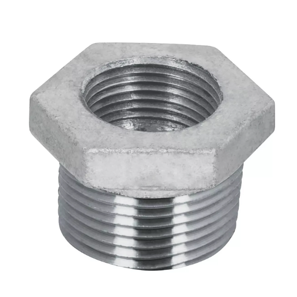 REDUCCIÓN BUSH GALVANIZADA: CONECTOR DE ACERO RECUBIERTO DE ZINC, RESISTENTE A LA CORROSIÓN. PERFECTO PARA UNIR TUBERÍAS DE DIFERENTES DIÁMETROS EN INSTALACIONES INDUSTRIALES Y DOMÉSTICAS.