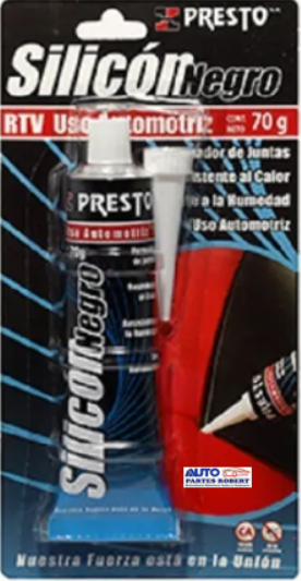 EL SILICON PRESTO NEGRO 70 G ES UN SELLADOR AUTOMOTRIZ DE ALTA TEMPERATURA, IDEAL PARA JUNTAS DE MOTORES, CAJAS DE CAMBIOS Y SISTEMAS DE ESCAPE.