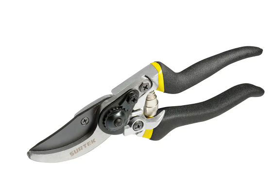 Tijeras de poda de una mano, tipo bypass, ideales para cortes precisos en ramas verdes. Cuerpo ligero de aluminio y diseño ergonómico que permite un uso cómodo y prolongado.