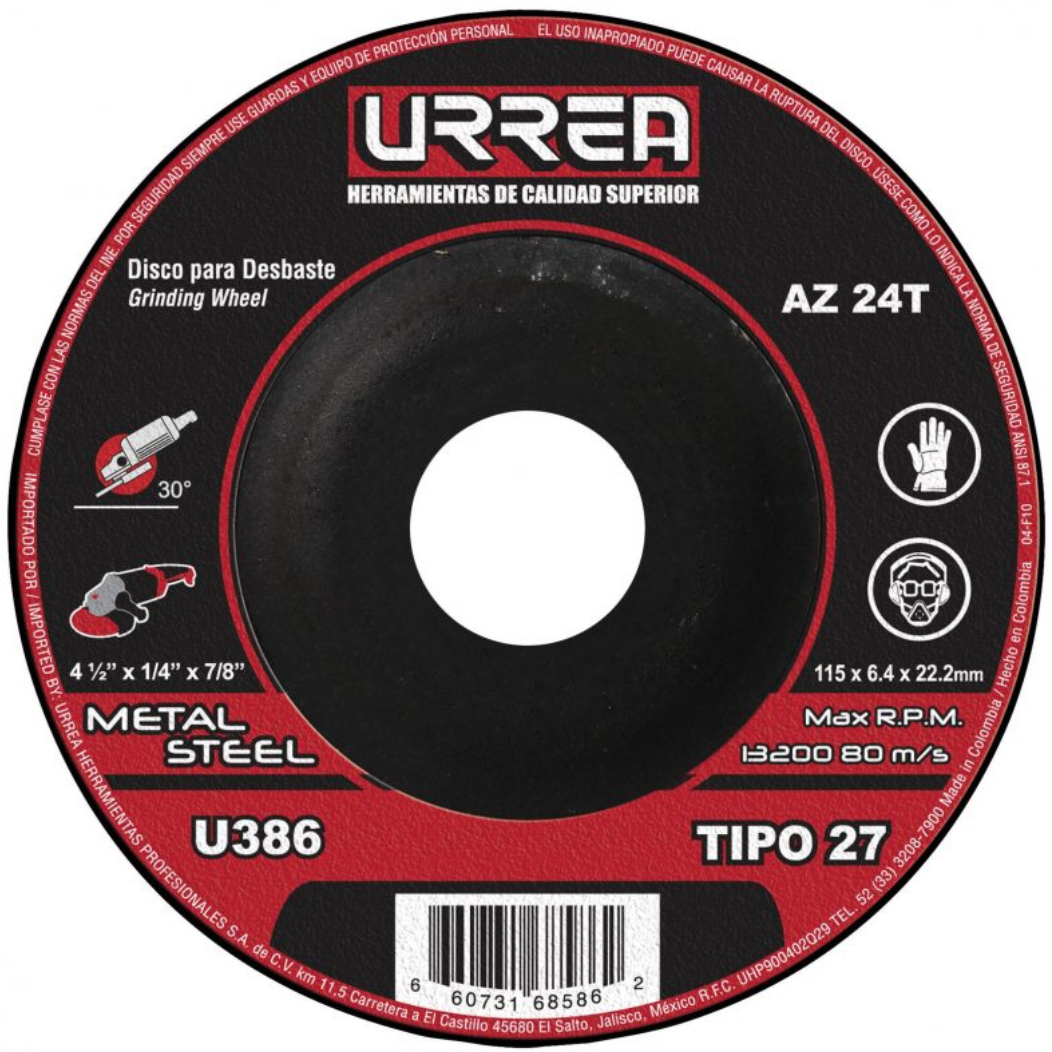 U386 DISCO ABRASIVO TIPO 27 PARA METAL 4-1/2" X 1/4" URREA